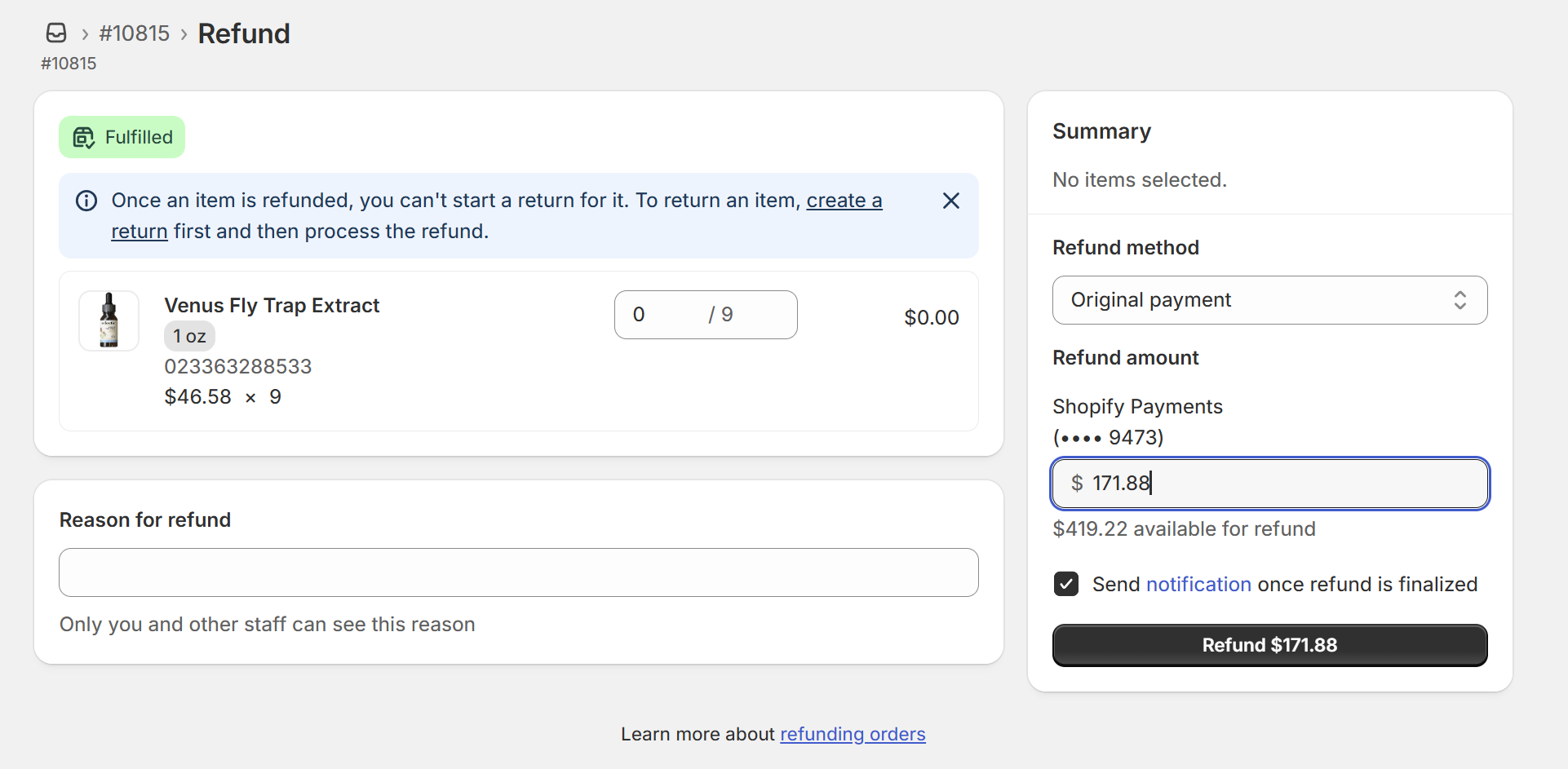 - Click order, click refund: